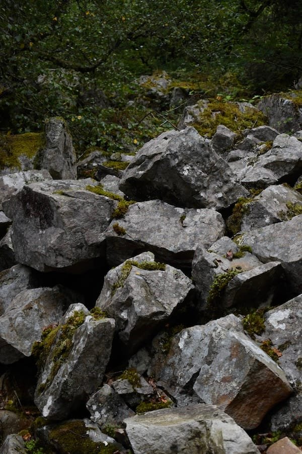 Following the path for a few kilometres along winding gravel paths leads to the second signpost for Sgwd Isaf Clun-Gwyn translated to the Lower Fall of the White Meadow. There is quite a descent to reach this next waterfall crossing over multi terrain. Decking steps have been introduced to improve the safety on some of the steeper drops. I would argue that this waterfall is the best out of the four as there are actually four spillways or ledges all flowing into a single point where all can be viewed from standing on boulders in the centre of the river. The water zig zags down with a range of drop points as the water almost grinds to a halt lower down, before gathering more momentum on its onward journey. The lush green vegetation and striking trees create a stunning backdrop as your eye is drawn upto the heavens. Moss covered boulders line the edges with eroded rock faces keeping them shaded. The sun light pokes through as you extend your view Northwards. This really is quite a magical view and very popular with photographers. Numbered marking on the face of stones on the right hand side indicate various viewing points. Please take care on this section as the rocks are wet and greasy and very very slippery.