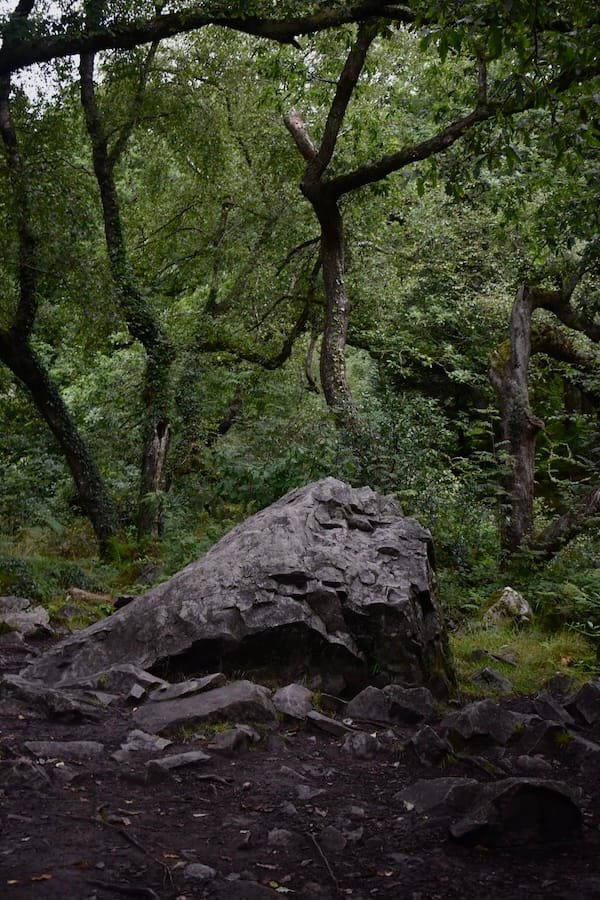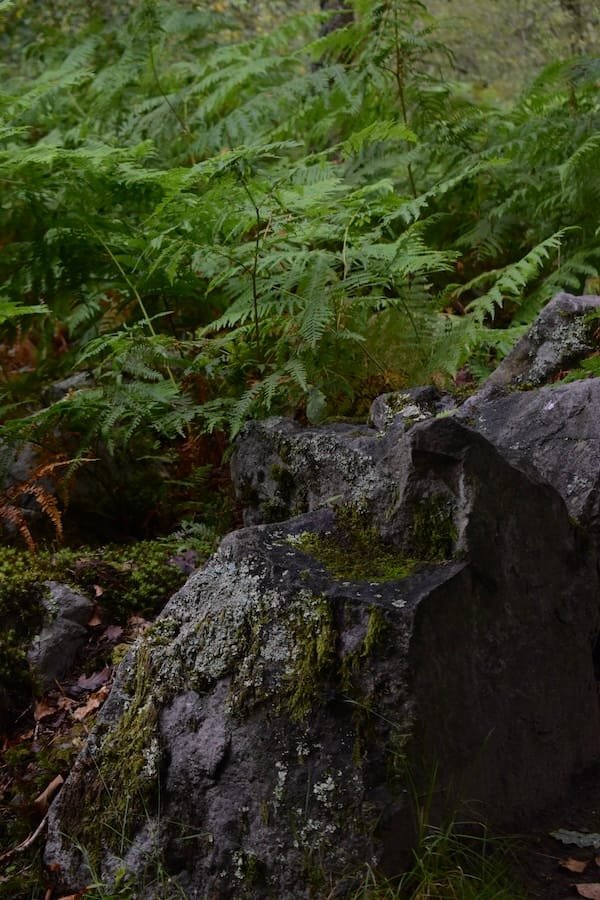 The walk starts along a wide gravel path and then starts to wind downhill through a beautiful enchanted forest resembling something out of a movie. Tall conifers line the horizon with large stones and boulders scattered around. Some of these have been used as markers and seats with natural flat tops. The first waterfall on the route is Sgwd Clun-Gwyn translated to ‘Fall of the white meadow’. The path to the viewing point was easily found and well signposted however we were only able to view from the top. The path to the base had become quite dangerous and trecherous with signs up and fencing around to block the path. It appeared as though repair work was in progress to restore the safety of the path. Stepping stones were carved out to form a path with tree roots overlapping so care and attention was required at all times. We were still able to get a great view of the water descending and the amplified sound of the water crashing off the sandstone rocks.