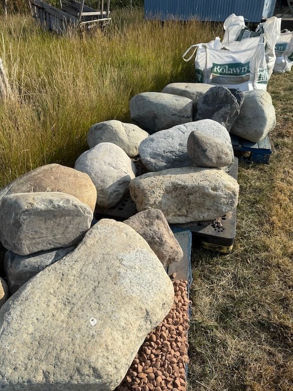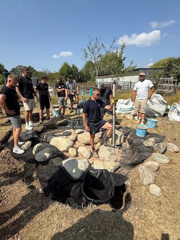 Rocks also create natural hiding spaces for fish and help stabilise the pond’s edges. Boulders do not need to touch the next one, creating gaps can encourage more wildlife into your ecosystem pond. If space allows, try and line up near to pond to minimise handling multiple times.