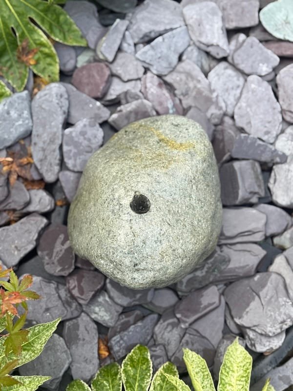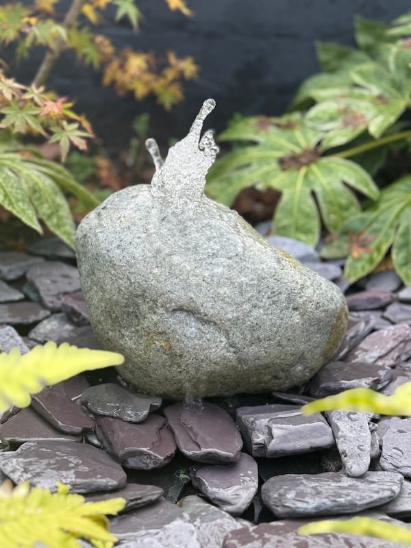 Glacial Boulder Water Feature SB193 is a stunning Medium sized rounded Glacial Boulder. Measuring 250mm long x 200mm wide and approximately 180mm high with lovely smooth, organic green and grey tones. Core drilled with a 25mm diameter core converts this into a working water feature. Sourced direct from the quarry in North Wales. Add a Medium Reservoir Pack to operate this as a water feature. Includes reservoir, pump, hose, clips and flow valve regulator. Check the photos carefully as they are of the exact boulder you will receive. Some images highlight vibrant markings and quartz streaks running through the boulder. Some of the toughest granite out there. The colours of natural stone deepen and intensify when wet. Gallery images show the stone boulder both wet and dry. View our youtube channel for a short video of the water flowing across the boulder. Increase the biodiversity of your own landscape instantly with this unique natural stone water feature. A very similar alternative feature stone to Glacial Boulder Water Feature SB193 is Stone Boulder SB61. If you prefer a non drilled boulder then Stone Boulder SB52 standing stone is an alternative. For inspiration take a look at America’s Wild, presented by Trailfinders & Visit the USA which just won Gold at Hampton Court Palace Garden Festival. The slate paddle stones seen in the photos are also available to purchase on the website. We recommend two handy bags to cover the lid of the medium sized reservoir. Alternatively, use a matching crushed aggregate such as 20mm cotswold style chippings. Edged with grey slate setts measuring 200mm x 100mm x 40mm thick contain the beach pebbles and prevent overspill and contamination with grass or other materials. Contact us with any questions or queries. Lots more stone available in the yard ready to be transformed into stunning water features. You’re welcome to visit the workshop but please do book an appointment in advance.