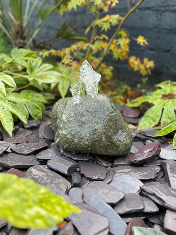 Glacial Boulder Water Feature SB197 is a stunning small sized Glacial Boulder. Measuring 300mm long x 200mm wide and approximately 180mm high with lovely smooth, organic green and grey tones. Core drilled with a 25mm diameter core converts this into a working water feature. Resembling a small volcanoe or egg shape with nice elevation in the centre. Sourced direct from the quarry in North Wales. Add a Medium Reservoir Pack to operate this as a water feature. Includes reservoir, pump, hose, clips and flow valve regulator. Check the photos carefully as they are of the exact boulder you will receive. Some images highlight vibrant markings and quartz streaks running through the boulder. Some of the toughest granite out there. The colours of natural stone deepen and intensify when wet. Gallery images show the stone boulder both wet and dry. View our youtube channel for a short video of the water flowing across the boulder. Increase the biodiversity of your own landscape instantly with this unique natural stone water feature. A very similar alternative feature stone to Glacial Boulder Water Feature SB197 is Stone Boulder SB61. If you prefer a non drilled boulder then Stone Boulder SB52 standing stone is an alternative. For inspiration take a look at America’s Wild, presented by Trailfinders & Visit the USA which just won Gold at Hampton Court Palace Garden Festival. The slate paddle stones seen in the photos are also available to purchase on the website. We recommend two handy bags to cover the lid of the medium sized reservoir. Alternatively, use a matching crushed aggregate such as 20mm cotswold style chippings. Edged with grey slate setts measuring 200mm x 100mm x 40mm thick contain the beach pebbles and prevent overspill and contamination with grass or other materials. Contact us with any questions or queries. Lots more stone available in the yard ready to be transformed into stunning water features. You’re welcome to visit the workshop but please do book an appointment in advance.