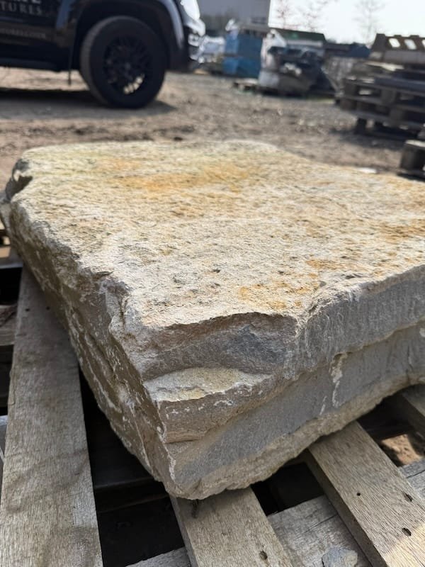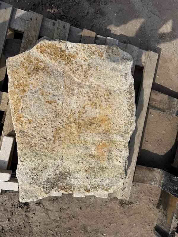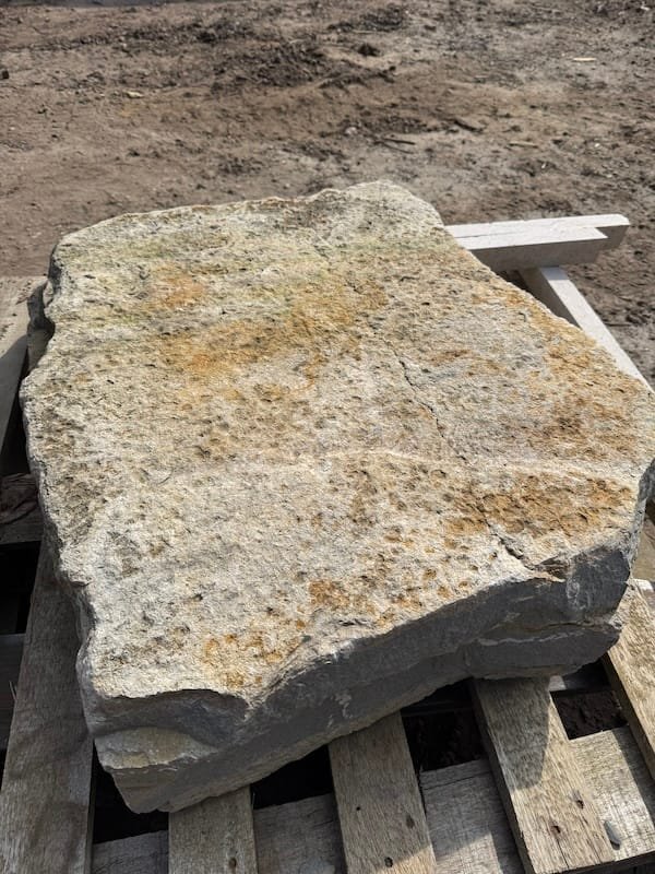 Purbeck Stone Chunky Slab PSCS2 selected at a UK quarry in Dorset and recently delivered to our workshop in Southampton. This is one of the larger flat top boulders we currently have in stock. It has not been sawn and has a naturally flat top and bottom with natural rounded edges. Measuring approximately 750mm long x 600mm wide x 200mm high. A nice rectangular shape full of earthy tones. Boulders of this size, shape and quality are becoming increasingly difficult to find in the quarry. Please contact us to discuss your bespoke requirements. We could also drill this as a water feature at additional cost but you would need a very big container or reservoir to catch and recirculate the water. An alternative option is to carve the stone in such a way to create a smaller channel for the water to meander over and flow down the side of the rock into a container. Another suitable application would be as a large seat or a platform next to a swimming pool or a platform for a large sculpture to be placed on top. We could also transform this into a Tsukubai Wash Basin complete with bowl and bamboo spout like Tsukubai Wash Basin TWB01. Please check the photos carefully as they are of the exact unique boulder for sale and there is only one available. Product image gives some scale of the size of this stone with gallery images showing some closer detailed shots. Please contact us with any questions you may have. Happy to discuss lifting requirements and options for handling this size stone. See some previous examples and additional info on our Info page. We have approx 40 big Purbeck boulders currently in stock ready to go. If you like Stone Boulder SB90 we can also transform these into water features like Stone Boulder SB62 Water Featue or carve a bowl as a garden bird bath like Stone Boulder Bird Bath SBB16. Alternatively we can carve all the way through and transform into a stone boulder fire pit like Stone Boulder SB64 Fire Pit. These are just some examples of the work we have done. If you are a designer and have an idea in mind then please contact us to discuss your requirements. We have many years of experience sourcing, selecting, crafting and transforming stone into functional pieces of garden art.