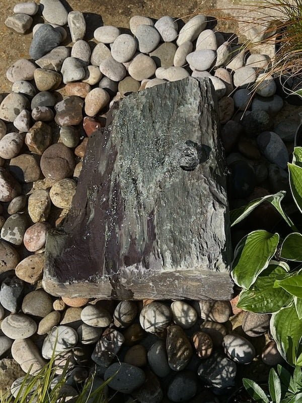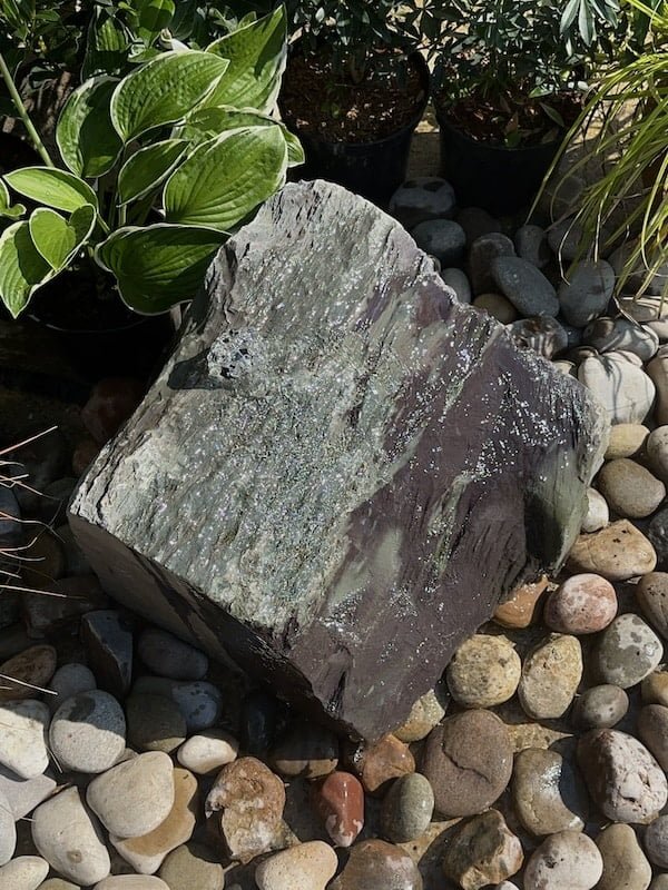 Slate Boulder SB120 Water Feature was hand picked from a welsh quarry in North Wales. Measuring approximately 370mm wide x 400mm long x 310mm high. Drilled centrally at the highsest point, water will flow evenly across the slate in all directions. This natural stone features a lovely blend of colours, predominantly plum tones with random splashes of light green on the face that are intensified when wet. This is an unusually blocky, angular boulder and is very rare to find in this particular quarry. A sloping top will ensure complete coverage across the entire piece and will create interest as the water cascades down over the slate. Slate Boulder SB120 Water Feature is classed as a Medium boulder due to the size and width but as this is not very high, this is classed as a one/two person lift. Please check the photos carefully as they are of the exact piece for sale. Images show a number of angles including wet and dry. Add our Reservoir Pack in the basket to complete the water feature functionality. The complimentary beach cobbles seen in the photos are also available to purchase on the website. We recommend two handy bags to cover the lid of the reservoir. Alternatively you can use slate chippings or slate paddle stones to retain the same colour palette. Simlar style alternatives to Slate Boulder SB120 Water Feature include Slate Boulder SB65 and Slate Boulder SB41. Water features are the perfect way to attract wildlife into your garden and also adds a calming, sensory experince aswell. Increase the biodiversity of your own garden and landscape instantly with this unique welsh slate water feature. We have lots more slate and stone available in the yard ready to be transformed into stunning water features. You are welcome to visit the workshop but please to book an appointment in advance. Please Contact us to book an appointment or with any questions or queries. Free UK Delivery.
