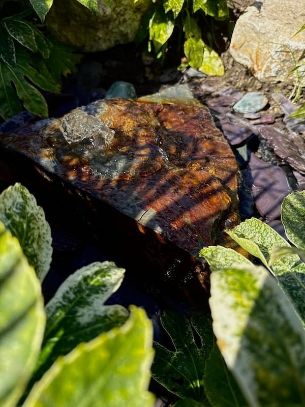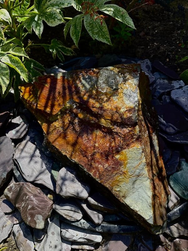 Slate Boulder SB208 Water Feature was hand picked from a welsh quarry in Pembrokeshire.  Measuring approximately 600mm wide x 400mm long x 160mm high. Drilled centrally at the highsest point, water will flow evenly across the slate in all directions. This natural stone features a lovely blend of colours, with some rusty fools gold tones on the top face that are intensified when wet. This is an unusually blocky, angular boulder and is very rare to find in this particular quarry. A flat top will ensure complete coverage across the entire piece and will create interest as the water cascades down over the slate. Slate Boulder SB208 Water Feature is classed as a Large boulder due to the size and width but as this is not very high, this is classed as a one person lift. Please check the photos carefully as they are of the exact piece for sale. Images show a number of angles including wet and dry. Add our Medium Reservoir Pack in the basket to complete the water feature functionality. The complimentary beach cobbles seen in the photos are also available to purchase on the website. We recommend two handy bags to cover the lid of the reservoir. Alternatively you can use slate chippings or slate paddle stones to retain the same colour palette. Simlar style alternatives to Slate Boulder SB116 Water Feature include Slate Boulder SB65 and Slate Boulder SB41. Water features are the perfect way to attract wildlife into your garden and also adds a calming, sensory experince aswell. Increase the biodiversity of your own garden and landscape instantly with this unique welsh slate water feature. We have lots more slate and stone available in the yard ready to be transformed into stunning water features. You are welcome to visit the workshop but please to book an appointment in advance. Please Contact us to book an appointment or with any questions or queries. Free UK Delivery.