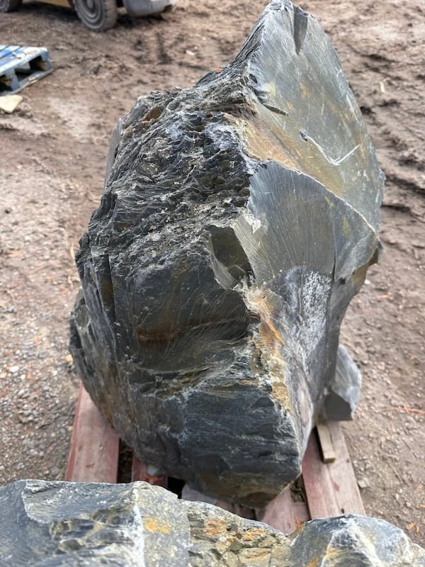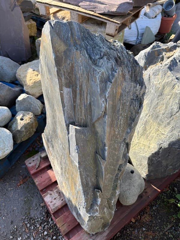 Slate Monolith SM352 is a clean, elegant natural stone obelisk for use in a landscaping or Japanese style garden design project. Sourced direct from the quarry in North Wales. Measuring approximately 1metre high x 800mm wide x 400mm thick. The shape of this stone resembles a sail with its triangular form. Full of slate grey tones and a splash of fools gold which light up when the sun hits the slate. This could be highlighted with subtle lighting at night to make a real statement in your garden design. Measuring approximately 950mm high, this is a very heavy piece and will need machinery to lift and move on site. Only one available and truly a one off. This slate monolith is not suitable for drilling or converting to a water feature, please contact us with any questions. If you like Slate Monolith SM352 but require something larger then please view our Large Slate Monolith category. Combine with a couple more stones at varying heights to make a real focal point in your garden and ease the transition in size. Alternative use for slate monolith SM352 as a memorial stone or marker stone. See our gallery for ideas and inspiration. If you wish to visit the workshop then please do not hesitate to get in touch to book an appointment.