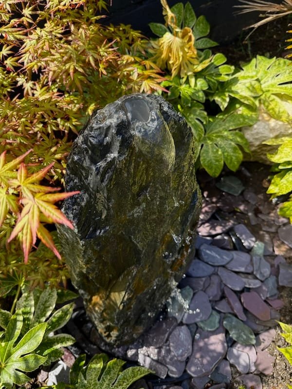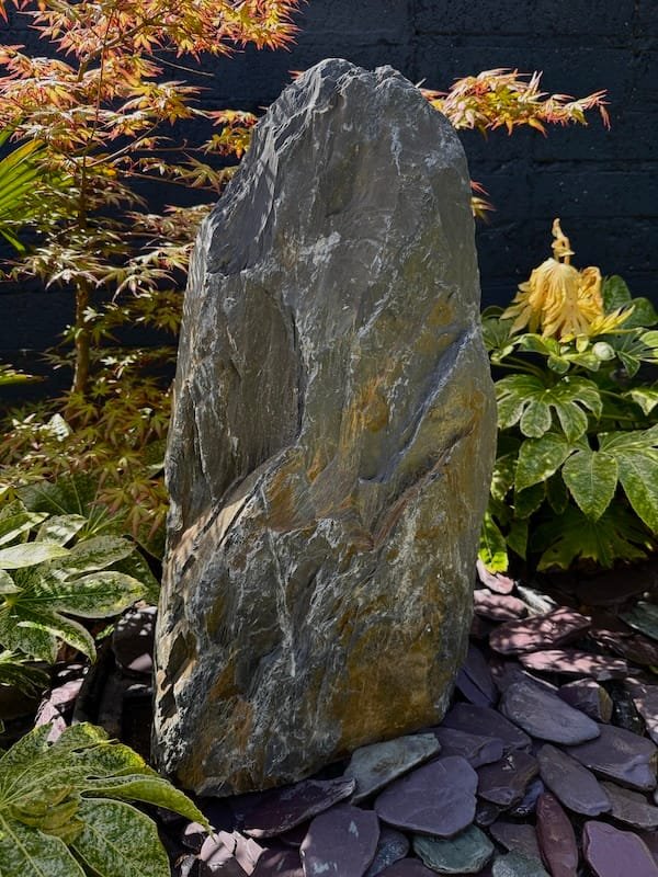 Slate Monolith Water Feature SM360 was chosen at a quarry in North Wales and hand finished in our Southampton workshop. Measuring 675mm tall, this Medium slate monolith is ideal for a medium or large modern garden design. Alternative use as a feature stone in a large Japanese garden design, or as part of a group of stones in a larger landscaping project. Sawn base provides a flat and safe stable base. Premium quality welsh slate measuring 350mm x 200mm makes this a manageable piece. Weighs in at 70kg so can be moved realtively easy on site without the need for mechanical lifting and cranes. Add Large Reservoir Pack in basket to complete the operation as a water feature. Slate of this size, quality and characteristics is becoming increasingly difficult to source in the quarry. We can hold this slate monolith feature in the yard until you’re ready for delivery or until your landscapers arrive on site. This can easily be combined with similar size stones to create a Japanese themed garden or Zen like retreat in your garden. Combine with other slate or stone products such as slate chippings and slate stepping stones to create a simple Japanese style garden. Please see additional product gallery images highlighting beautiful markings. Contact us now with any questions or queries you may have about Slate Monolith Water Feature SM360. An alternative option for undrilled monoliths is Slate Monolith SM304 Water Feature or Slate Monolith SM311 Water Feature. Please contact us for a quote on any additional work. A recent case study showing a similar style used as a memorial stone and another example of a stunning Japanese Garden Design by Instant Scenery. The images really don’t do this stone justice as it really is a stand out piece with unique curves and character.