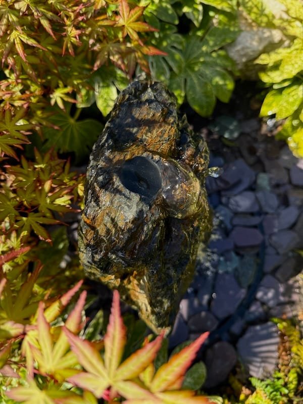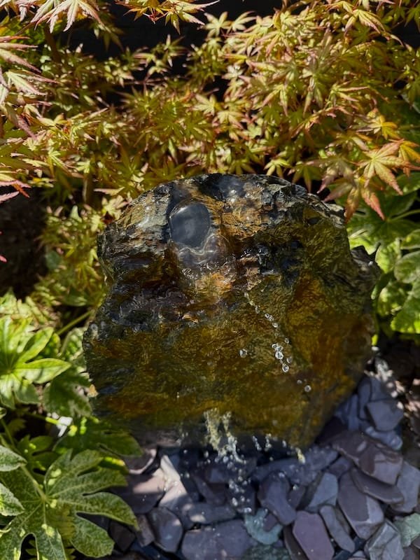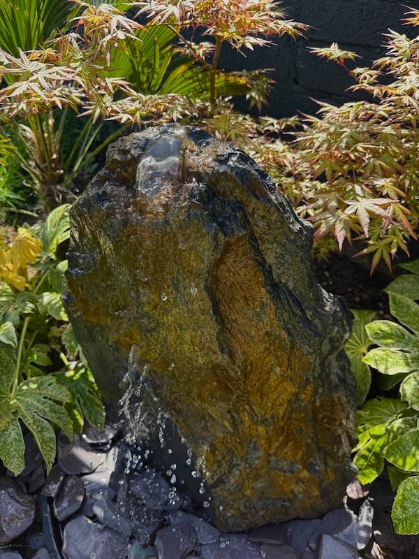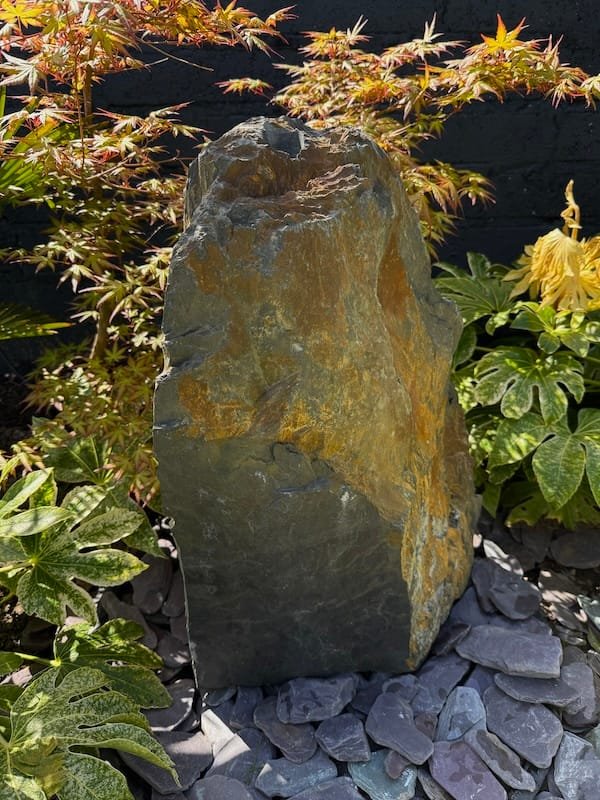 Slate Monolith Water Feature SM363 was chosen at a quarry in North Wales and hand finished in our Southampton workshop. Measuring 650mm tall, this Medium slate monolith is ideal for a medium or large modern garden design. Alternative use as a feature stone in a large Japanese garden design, or as part of a group of stones in a larger landscaping project. Sawn base provides a flat and safe stable base. Premium quality welsh slate measuring 300mm x 200mm makes this a manageable piece. Weighs in at 83kg so can be moved realtively easy on site without the need for mechanical lifting and cranes. Add Large Reservoir Pack in basket to complete the operation as a water feature. Slate of this size, quality and characteristics is becoming increasingly difficult to source in the quarry. We can hold this slate monolith feature in the yard until you’re ready for delivery or until your landscapers arrive on site. This can easily be combined with similar size stones to create a Japanese themed garden or Zen like retreat in your garden. Combine with other slate or stone products such as slate chippings and slate stepping stones to create a simple Japanese style garden. Please see additional product gallery images highlighting beautiful markings. Contact us now with any questions or queries you may have about Slate Monolith Water Feature SM363. An alternative option for undrilled monoliths is Slate Monolith SM304 Water Feature or Slate Monolith SM311 Water Feature. Please contact us for a quote on any additional work. A recent case study showing a similar style used as a memorial stone and another example of a stunning Japanese Garden Design by Instant Scenery. The images really don’t do this stone justice as it really is a stand out piece with unique curves and character.