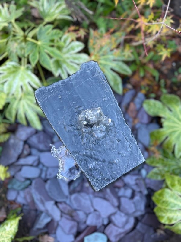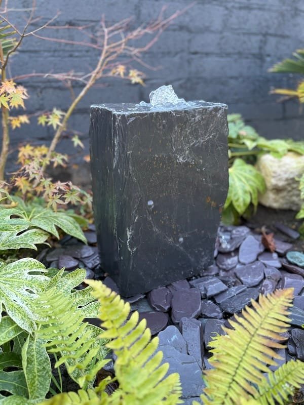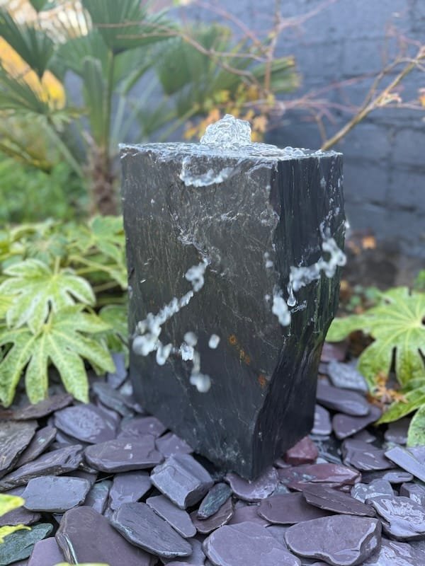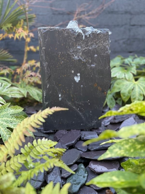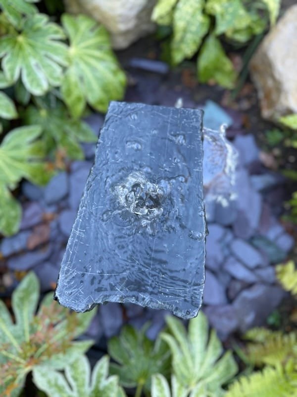 Slate Monolith Water Feature SM366 was chosen at a quarry in North Wales and hand finished in our Southampton workshop. Measuring 420mm tall, this Medium slate monolith is ideal for a medium or large modern garden design. A slightly different design to normal, with a sawn top. This extends the time it takes the water to flow over the slate, creating more interest. Alternative use as a feature stone in a large Japanese garden design, or as part of a group of stones in a larger landscaping project. Sawn base provides a flat and safe stable base. Premium quality welsh slate measuring 300mm x 180mm makes this a manageable piece. Weighs in at around 50kg so can be moved realtively easy on site without the need for mechanical lifting and cranes. Add a Medium or Large Reservoir Pack in basket to complete the operation as a water feature. Slate of this size, quality and characteristics is becoming increasingly difficult to source in the quarry. We can hold this slate monolith feature in the yard until you’re ready for delivery or until your landscapers arrive on site. This can easily be combined with similar size stones to create a Japanese themed garden or Zen like retreat in your garden. Combine with other slate or stone products such as slate chippings and slate stepping stones to create a simple Japanese style garden. Please see additional product gallery images highlighting beautiful markings. Contact us now with any questions or queries you may have about Slate Monolith Water Feature SM366. An alternative option for undrilled monoliths is Slate Monolith SM304 Water Feature or Slate Monolith SM311 Water Feature. Please contact us for a quote on any additional work. A recent case study showing a similar style used as a memorial stone and another example of a stunning Japanese Garden Design by Instant Scenery. The images really don’t do this stone justice as it really is a stand out piece with unique curves and character.