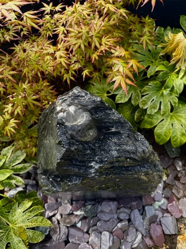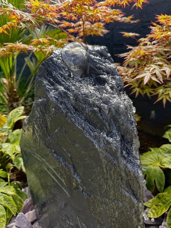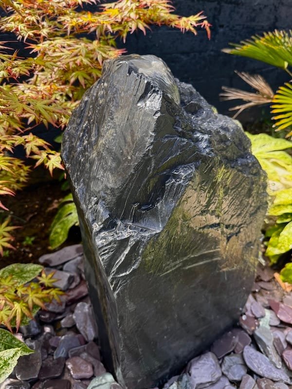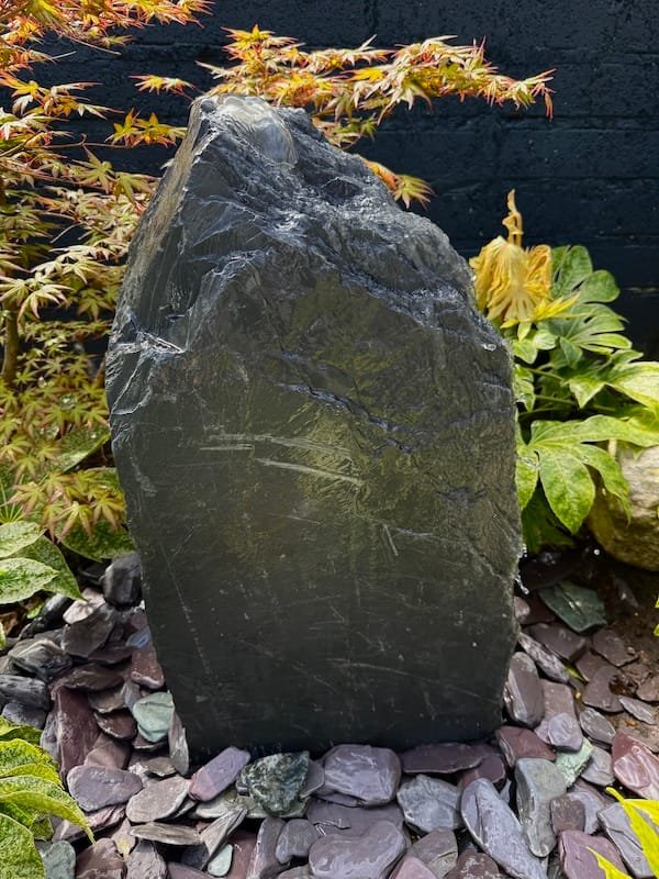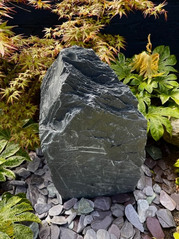 Slate Monolith Water Feature SM369 was chosen at a quarry in North Wales and hand finished in our Southampton workshop. Measuring 650mm tall, this Medium slate monolith is ideal for a medium or large modern garden design. Alternative use as a feature stone in a large Japanese garden design, or as part of a group of stones in a larger landscaping project. Sawn base provides a flat and safe stable base. Premium quality welsh slate measuring 400mm x 200mm makes this a manageable piece. Weighs in at around 150kg so can be moved realtively easy on site without the need for mechanical lifting and cranes. Add a Medium or Large Reservoir Pack in basket to complete the operation as a water feature. Slate of this size, quality and characteristics is becoming increasingly difficult to source in the quarry. We can hold this slate monolith feature in the yard until you’re ready for delivery or until your landscapers arrive on site. This can easily be combined with similar size stones to create a Japanese themed garden or Zen like retreat in your garden. Combine with other slate or stone products such as slate chippings and slate stepping stones to create a simple Japanese style garden. Please see additional product gallery images highlighting beautiful markings. Contact us now with any questions or queries you may have about Slate Monolith Water Feature SM369. An alternative option for undrilled monoliths is Slate Monolith SM304 Water Feature or Slate Monolith SM311 Water Feature. Please contact us for a quote on any additional work. A recent case study showing a similar style used as a memorial stone and another example of a stunning Japanese Garden Design by Instant Scenery. The images really don’t do this stone justice as it really is a stand out piece with unique curves and character.