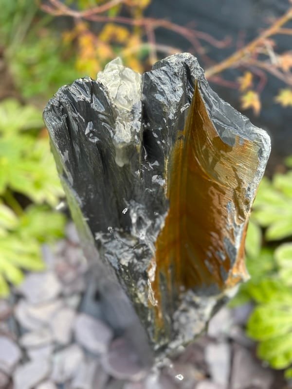 Slate Monolith Water Feature SM370 was chosen at a quarry in North Wales and hand finished in our Southampton workshop. Measuring 680mm tall, this Medium slate monolith is ideal for a medium or large modern garden design. Alternative use as a feature stone in a large Japanese garden design, or as part of a group of stones in a larger landscaping project. Sawn base provides a flat and safe stable base. Premium quality welsh slate measuring 270mm x 150mm makes this a manageable piece. Weighs in at around 150kg so can be moved realtively easy on site without the need for mechanical lifting and cranes. Add a Medium or Large Reservoir Pack in basket to complete the operation as a water feature. Slate of this size, quality and characteristics is becoming increasingly difficult to source in the quarry. We can hold this slate monolith feature in the yard until you’re ready for delivery or until your landscapers arrive on site. This can easily be combined with similar size stones to create a Japanese themed garden or Zen like retreat in your garden. Combine with other slate or stone products such as slate chippings and slate stepping stones to create a simple Japanese style garden. Please see additional product gallery images highlighting beautiful markings. Contact us now with any questions or queries you may have about Slate Monolith Water Feature SM370. An alternative option for undrilled monoliths is Slate Monolith SM304 Water Feature or Slate Monolith SM311 Water Feature. Please contact us for a quote on any additional work. A recent case study showing a similar style used as a memorial stone and another example of a stunning Japanese Garden Design by Instant Scenery. The images really don’t do this stone justice as it really is a stand out piece with unique curves and character.