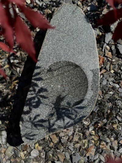 Stone Bowl Bird Bath SBB26 is a Medium sized bowl carved from Grey Granite. Rounded, with some stunning features and contours. Measuring 480mm long x 280mm wide x 120mm high. Weighing in at only 18kg makes this manageable and easy to move. The top has smooth, natural edges and a shallow bowl for retaining water and encouraging birds to an outdoor space. Clear reflections can be seen glistening over the clear water. This garden bird bath will suit both a traditional and contemporary garden design because while it retains natural earthy colour tones it also has a modern feel to it. It could also work to bring some contrast as a feature stone in a more traditional setting. Can also be used as a water bowl or vessel in a Japanese Garden Design. A bamboo spout could be added to drop water into the centre of the bowl and create a different style water feature. Please check the gallery carefully as the photos of Stone Bowl Bird Bath SBB26 show the high level of detailing within this piece. The bird bath was photographed dry, so will darken slightly when wet. The inner bowl has been delicately polished to give a rounded feel. Increase the biodiversity of your own garden instantly with this unique stone bird bath. This stone bowl bird bath design is very safe and sturdy unlike many stone bird baths which are in two seperate parts. Pictures are of the exact piece you will receive. Stone Bowl Bird Bath SBB26 is very similar in style to Stone Bird Bath SBB17. We have more large blocks in the yard suitable for stone bird baths. Can also be converted into a fully functioning water feature by core drilling centrally through the boulder from top to bottom at extra cost. Stone boulders of this size and shape are increasingly difficult to source in the quarry. Contact us with your requirements. See a short video on our youtube channel.