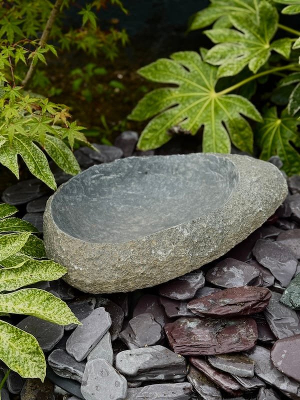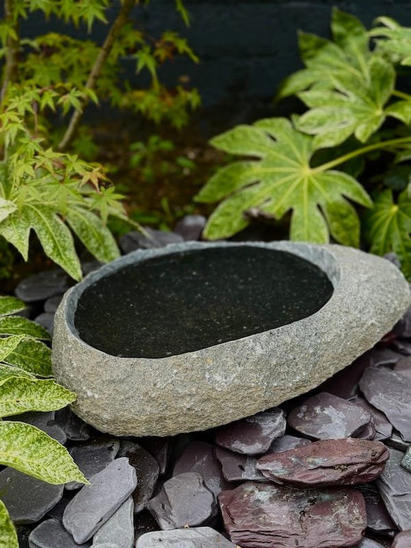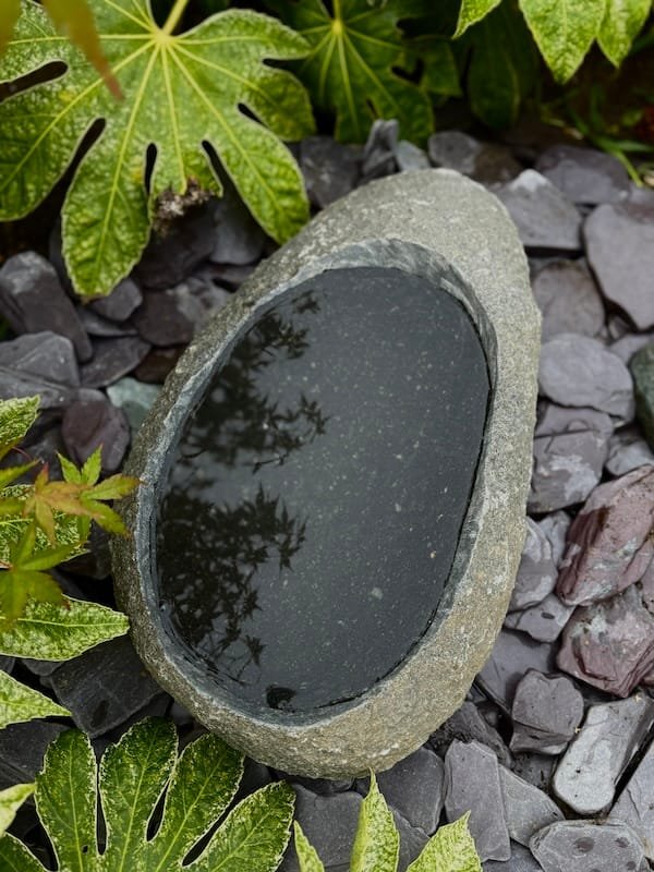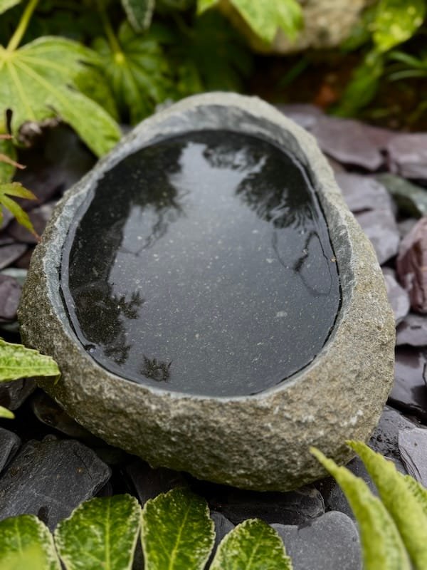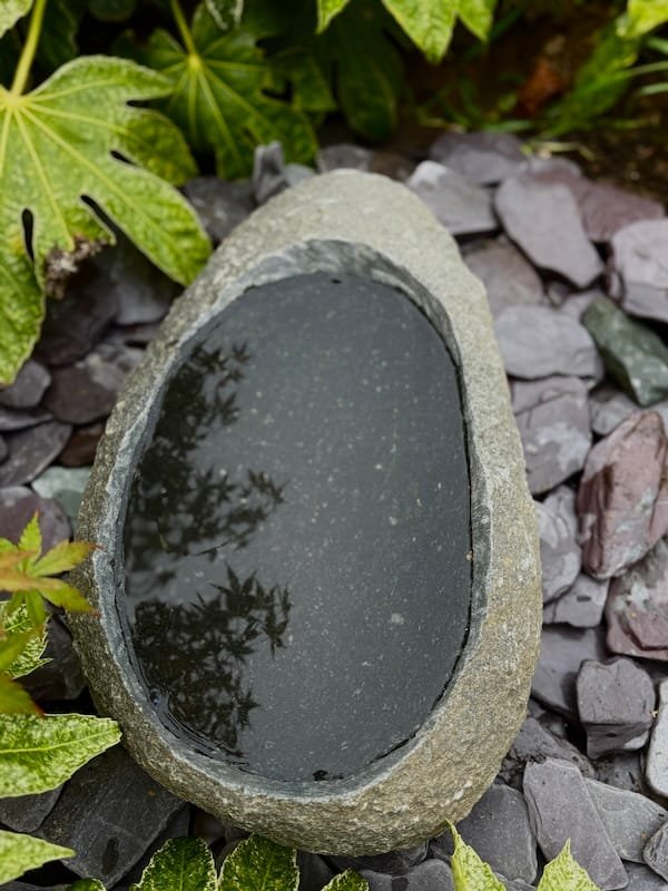 Stone Bowl Bird Bath SBB26 is a Medium sized bowl carved from Grey Granite. Rounded, with some stunning features and contours. Measuring 480mm long x 280mm wide x 120mm high. Weighing in at only 18kg makes this manageable and easy to move. The top has smooth, natural edges and a shallow bowl for retaining water and encouraging birds to an outdoor space. Clear reflections can be seen glistening over the clear water. This garden bird bath will suit both a traditional and contemporary garden design because while it retains natural earthy colour tones it also has a modern feel to it. It could also work to bring some contrast as a feature stone in a more traditional setting. Can also be used as a water bowl or vessel in a Japanese Garden Design. A bamboo spout could be added to drop water into the centre of the bowl and create a different style water feature. Please check the gallery carefully as the photos of Stone Bowl Bird Bath SBB26 show the high level of detailing within this piece. The bird bath was photographed dry, so will darken slightly when wet. The inner bowl has been delicately polished to give a rounded feel. Increase the biodiversity of your own garden instantly with this unique stone bird bath. This stone bowl bird bath design is very safe and sturdy unlike many stone bird baths which are in two seperate parts. Pictures are of the exact piece you will receive. Stone Bowl Bird Bath SBB26 is very similar in style to Stone Bird Bath SBB17. We have more large blocks in the yard suitable for stone bird baths. Can also be converted into a fully functioning water feature by core drilling centrally through the boulder from top to bottom at extra cost. Stone boulders of this size and shape are increasingly difficult to source in the quarry. Contact us with your requirements. See a short video on our youtube channel.