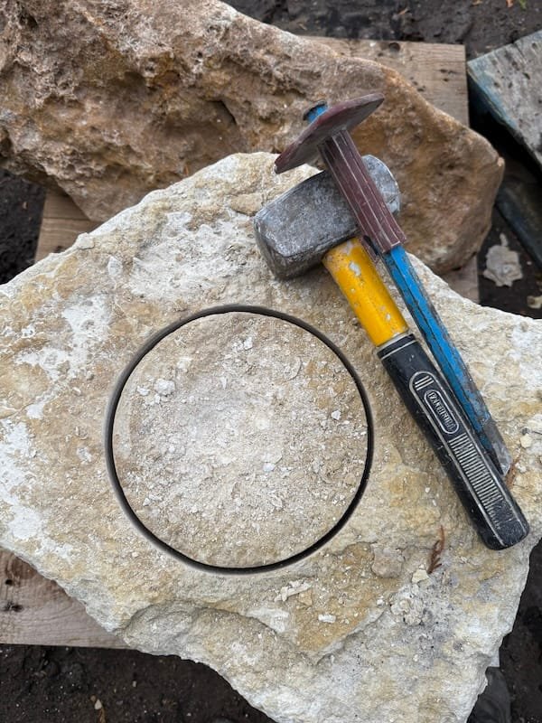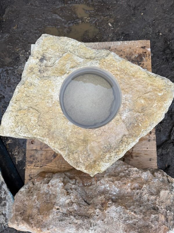 This Tsukubai Water Basin TWB04 was photographed wet and dry, it is slightly lighter when dry and darkens and the tones deepen when wet. This unique stone feature has a naturally rounded feel and fossils and shells can be seen throughout. Pictures are of the exact piece you will receive. Having developed a repeatable technique, these can be produced to your requirements. We have a number of variations on this design planned and in progress. Please do have a look at out previous Tsukubai Wash Basin TWB01 which sold straight away. The next one on the rig includes a large dish and a smaller dish with the water spout planned to sit seperate to the stone. If you like this design but require something slightly different please Contact us now to discuss your design. See our recent blog for more info on Tsukubai Wash Basins.