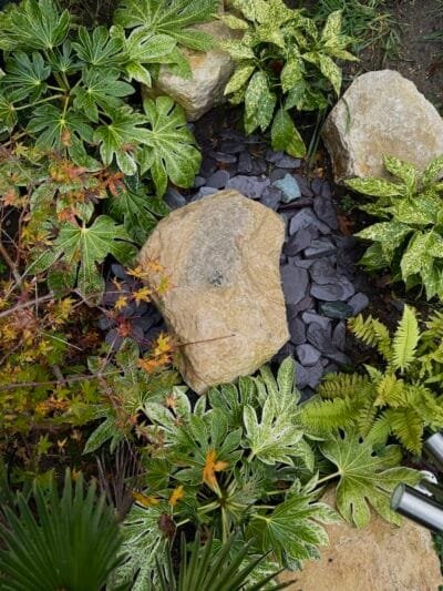 Slate Boulder SB118 Water Feature Case Study features a stunning low level slate boulder sourced direct from the quarry in Pembrokeshire. Blue and grey tones deepen in colour when wet with splashes of fools gold throughout. Slate Chippings were chosen to compliment the larger stone and ease the transition in size between boulder and ground level. Small grasses and shrubs will soon grow and fill the space with lush green colours. The large curved composite decking surrounds the slate boulder water feature perfectly and with integrated floor lighting will look superb at night. This simple addition creates a calming and relaxing environment for people seeking rest at the recently remodelled respite centre in Woking, Surrey. Welsh Slate Water Features were proud to be involved in this stunning project and supplied everything the client needed to operate this as a water feature. This included the core drilled boulder, a large reservoir pack, including pump, hose, clips and flow valve regulator. Finished off with two handy bags of slate chippings verying between 20 and 60mm. If you’re considering or working on a similar project and need any help or advice then please do not hesitate to contact the office and we will be happy to help and guide you on choosing the right slate boulder or water feature for your project.